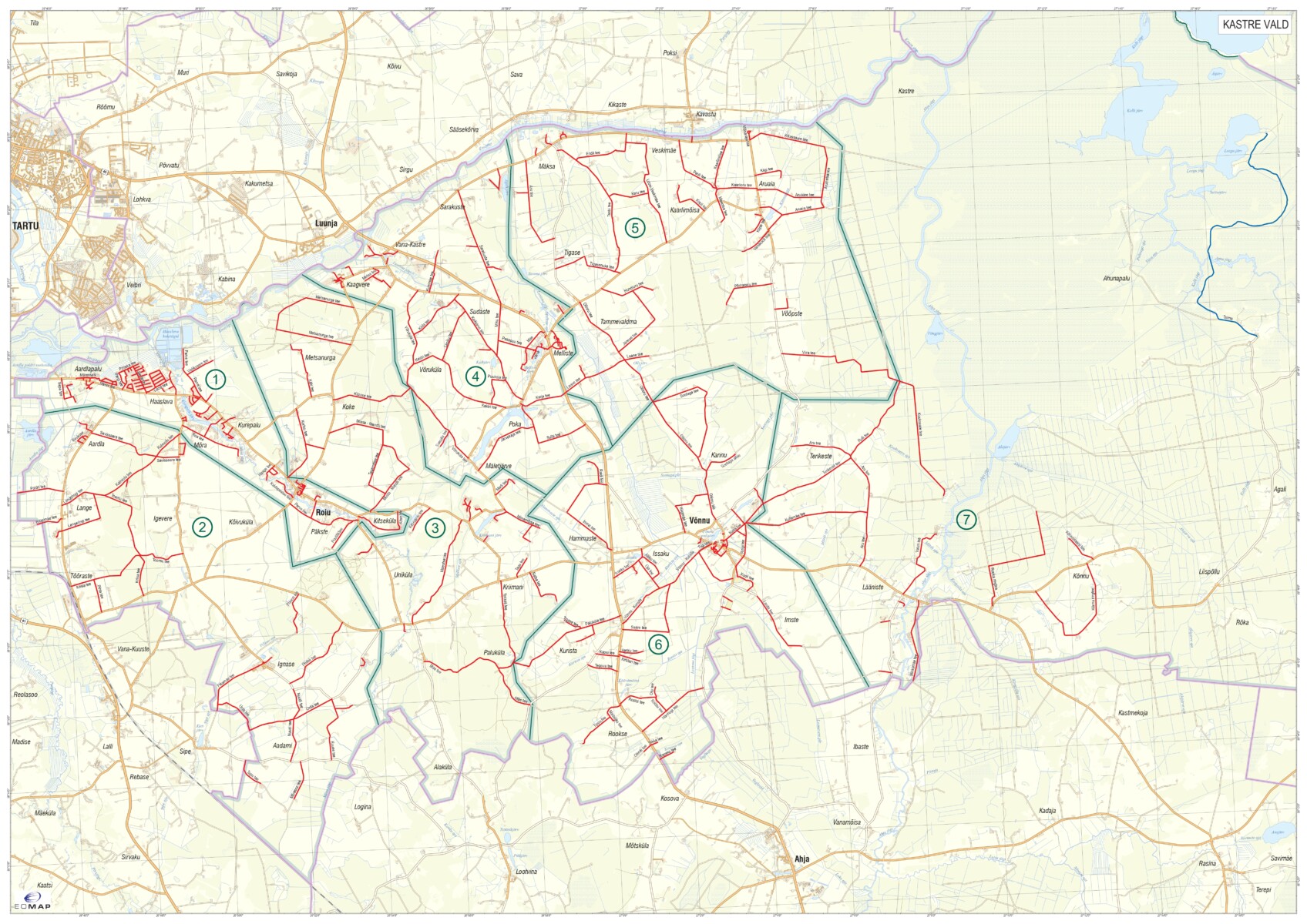 2. piirkond – Aardla, Mõra, Lange, Igevere, Tõõraste, Kõivuküla, Ignase, Aadami, Päkste (Priisoo tee), Uniküla (Roosi tee).